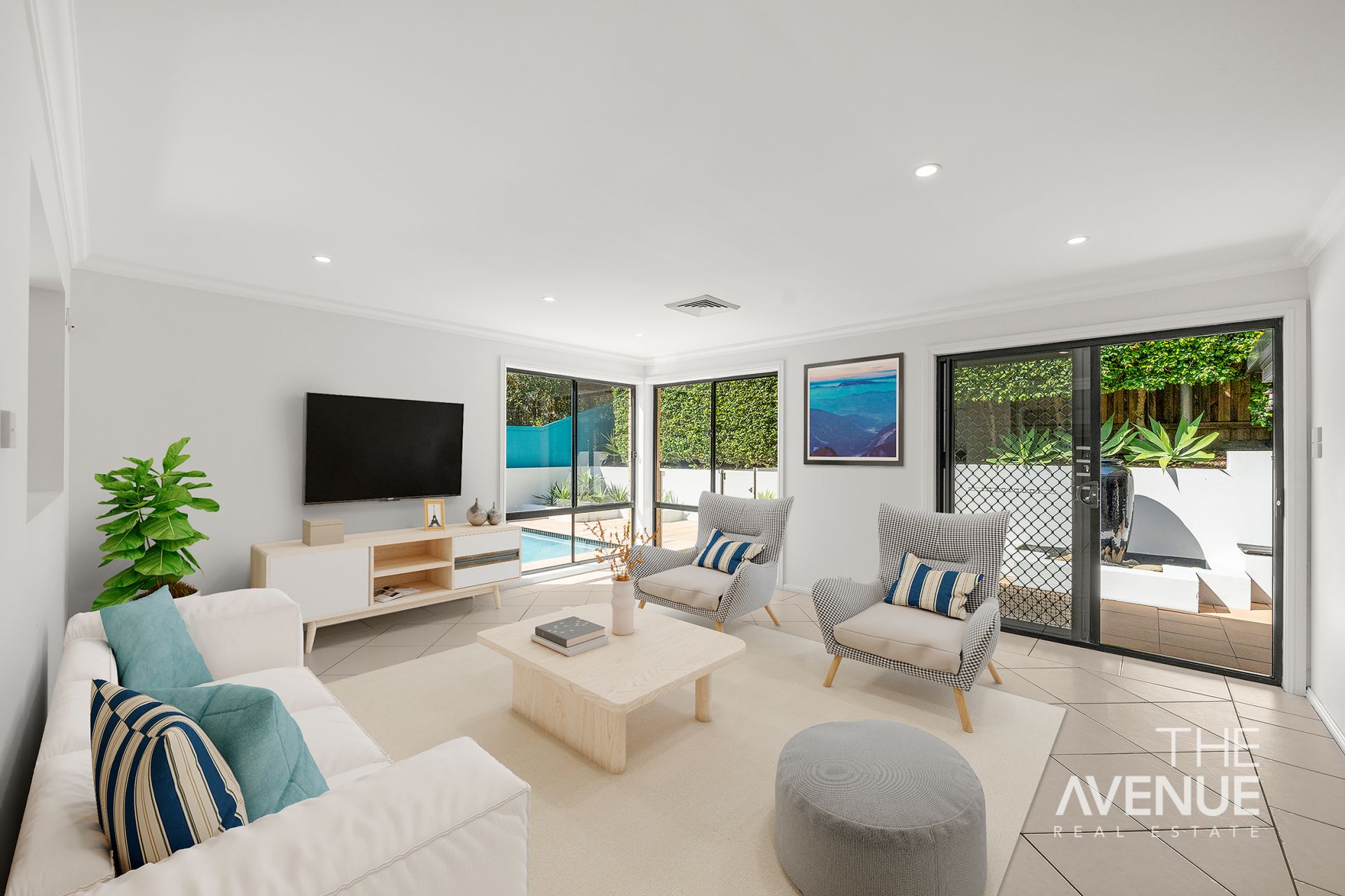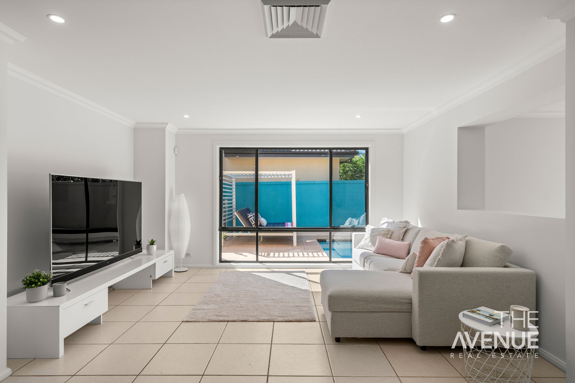The indoor living spaces overlook the sparkling inground pool, creating a tranquil oasis that connects beautifully with the outdoor alfresco area-perfect for summer gatherings!