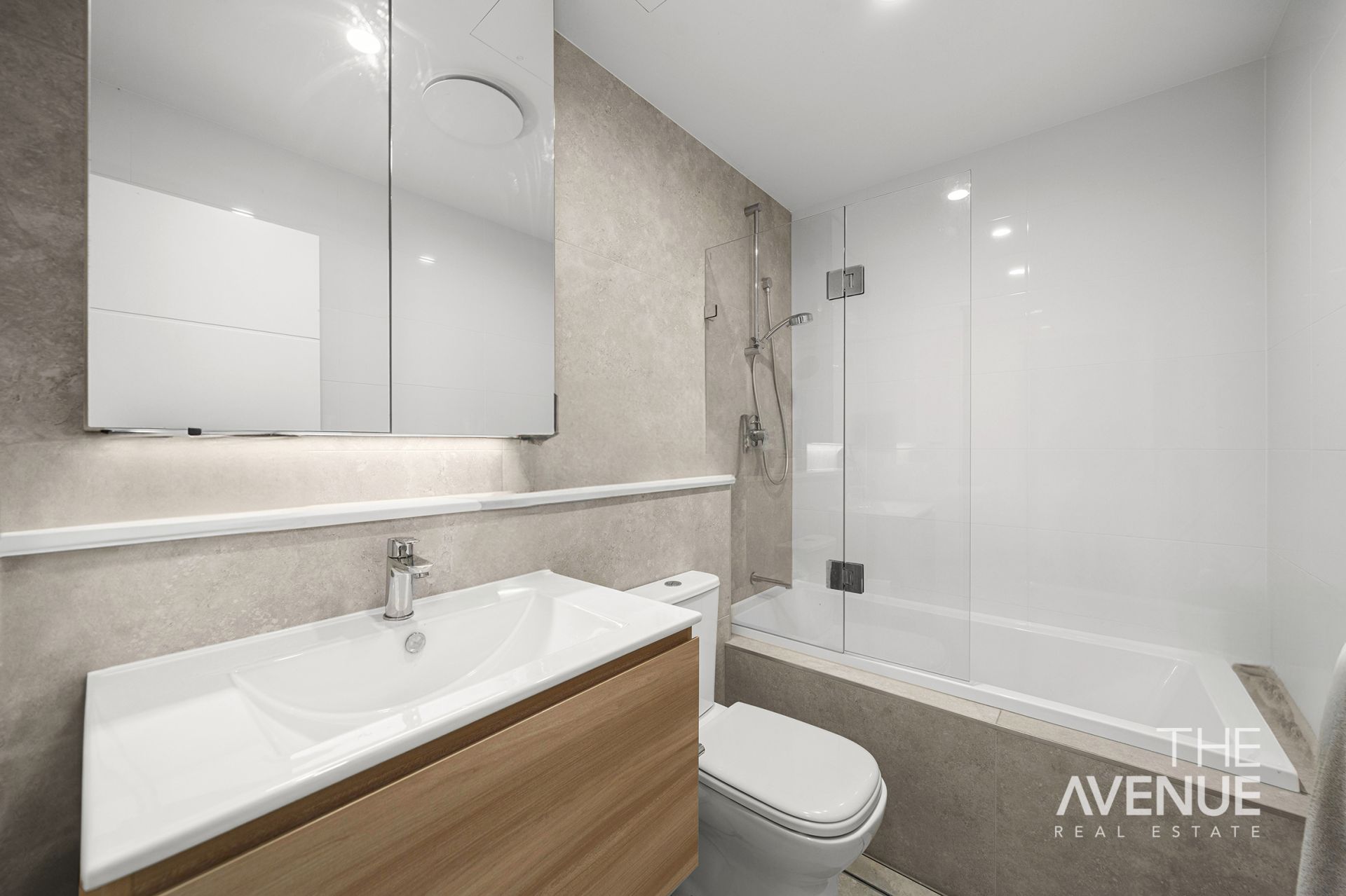 Designer bathrooms featuring sleek, large-format floor and feature tiles, full-height wall tiling, and wall-hung timber vanities for a sophisticated, streamlined look