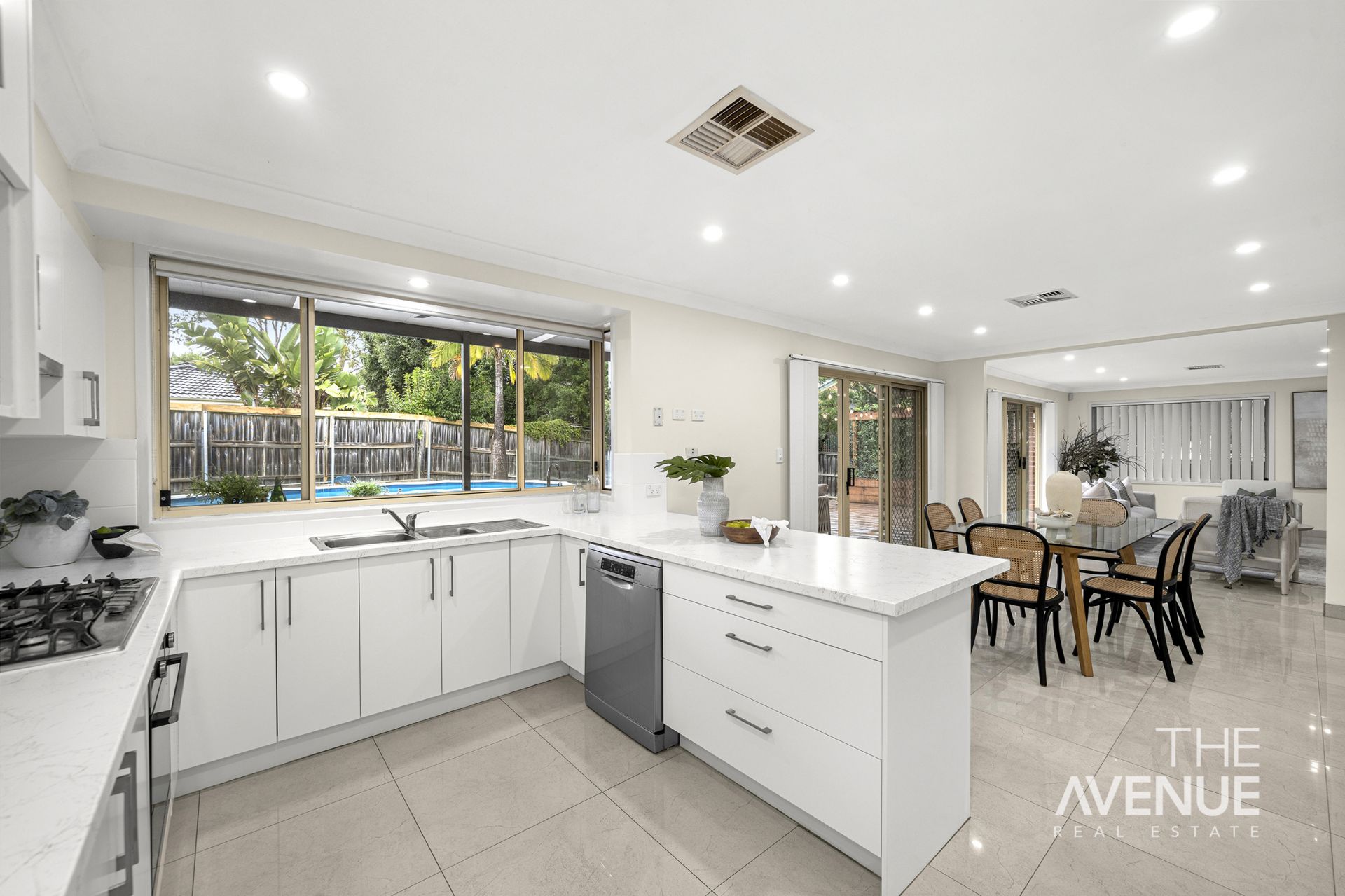 The outdoor area includes an above-ground swimming pool, massive contemporary alfresco with an outdoor kitchen and plenty of backyard space for the kids to play.