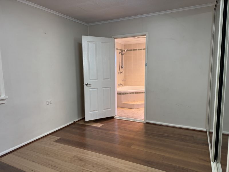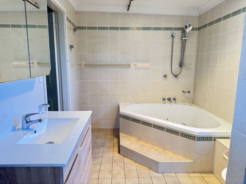 Main bedroom with built-in wardrobe and access to a two-way bathroom featuring a corner bathtub and combined laundry facilities.
